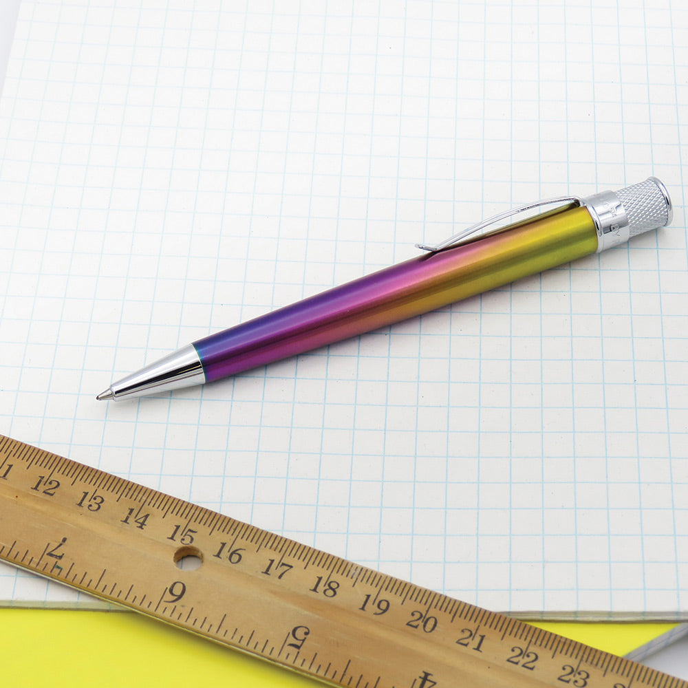 - Kromatik, renk bilimidir ve bu Tornado, canlı gökkuşağı rengiyle görsel algılarınızı bilimsel bir düzeye taşıyacak. Renk tayfı kalemin gövdesine iyonla kaplanır, ardından hafifçe fırçalanır ve parlak krom kaplamalarla tamamlanır. Her namlu, bir kalemden diğerine kendine özgü renk değişimine sahip olacaktır. Tornado Chromatic rollerball sizi, renk dalgalarının yalnızca gözünüzü ve beyninizi değil, yazınızı da uyardığı başka bir dünyaya götürecek. Her Tornado tükenmez kalem, her zaman olduğu gibi, kullanılmadığında kalem standı veya taşıma çantası olarak kullanılabilen Retro markalı bir grafik tüp içinde paketlenmiştir.
