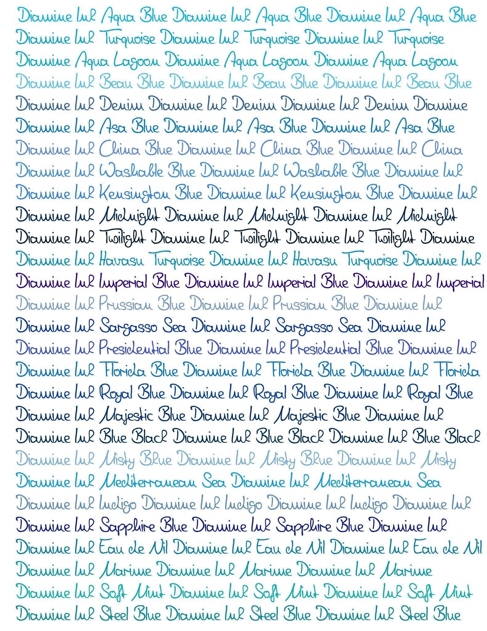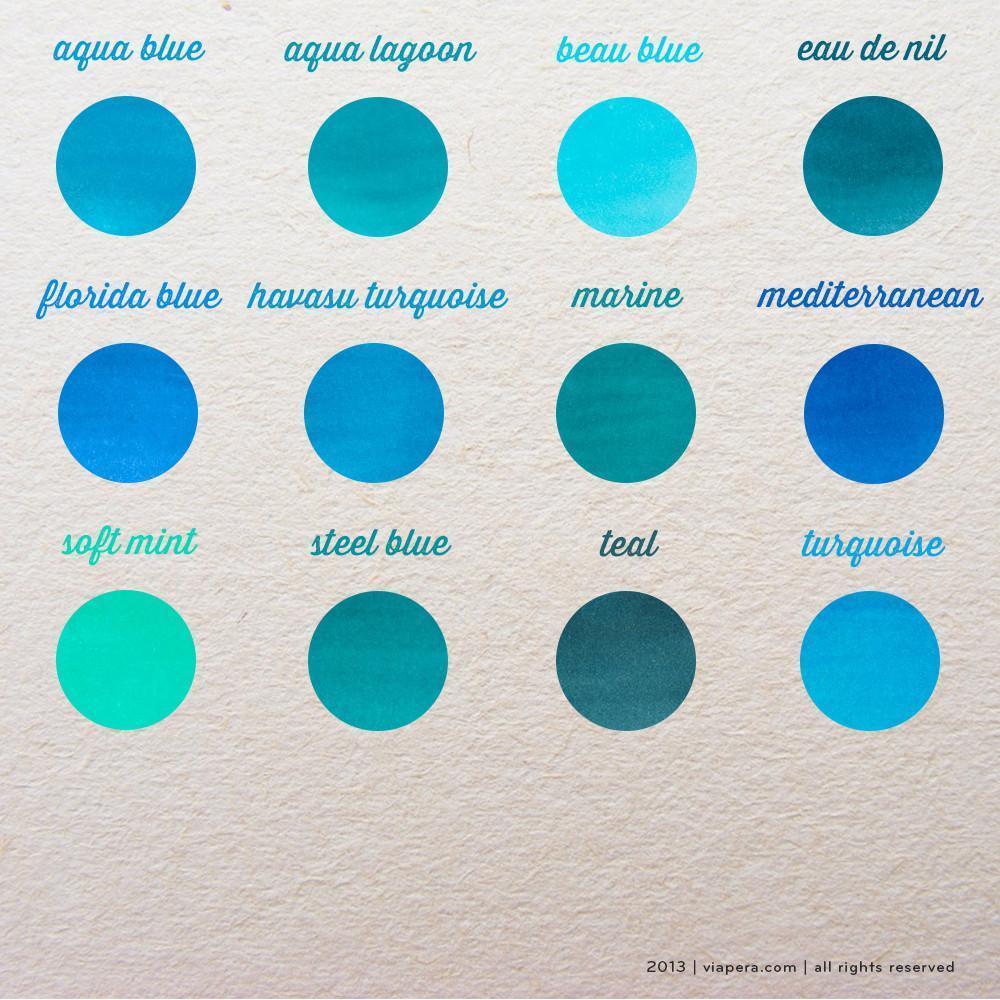 • Diamine dolmakalem mürekkeplerinin 98 farklı renk çeşidini daha rahat inceleyebilmeniz için tonlarına göre gruplara ayırdık. Turkuaz renk tonları olan Aqua blue, Aqua lagoon, Beau blue, Eau de nil, Florida blue, Havasu turquoise, Marine, Mediterranean, Soft mint, Steel blue, Teal, Turquoise renklerini bu sayfada bulabilirsiniz.