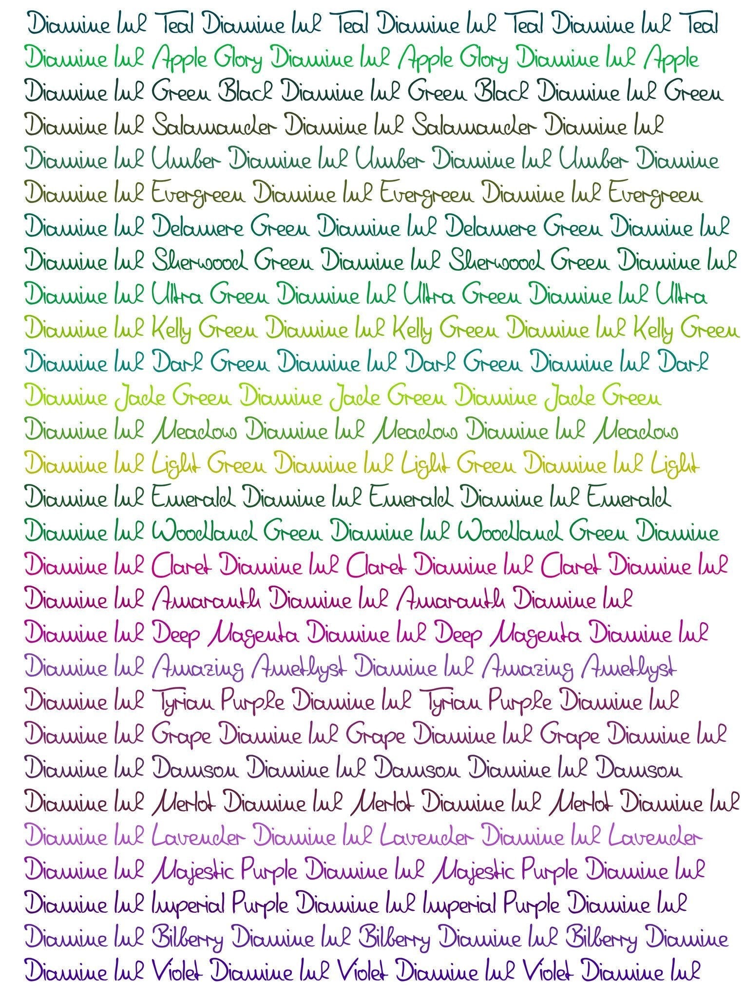 • Diamine dolmakalem mürekkeplerinin 98 farklı renk çeşidini daha rahat inceleyebilmeniz için tonlarına göre gruplara ayırdık. Yeşil renk tonları olan Apple glory, Dark green, Delamere, Emerald, Evergreen, Green black, Jade green, Kelly green, Light green, Meadow, Sherwood, Ultra green, Umber ve Woodland renklerini bu sayfada bulabilirsiniz.