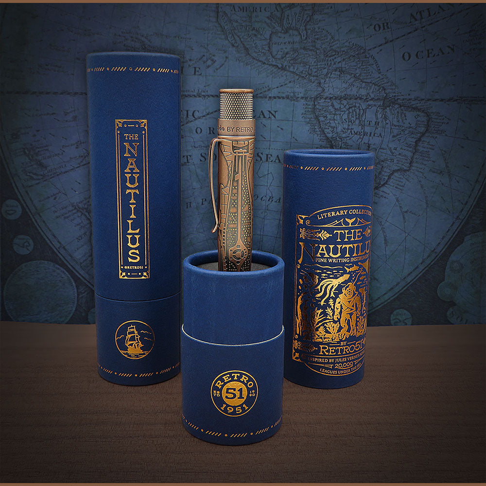 Bu hareketli hayat, eski bir kitap kapağını anımsatan folyo damgalı grafiklerle süslenmiş ambalaj tüpünde başlıyor. POP ile tüpü açtığınızda içindeki metal kalemi ortaya çıkardığınızda heyecan devam ediyor. Kalemin gövdesinin asitle kazınmış ve taşlanmış bakırla kaplanmış denizaltının ağırlığını, dokulu perçinlerini, panellerini ve ayrıntılarını deneyimleyin; bu kalem tıpkı esrarengiz kap gibi bir macera havası yayıyor.